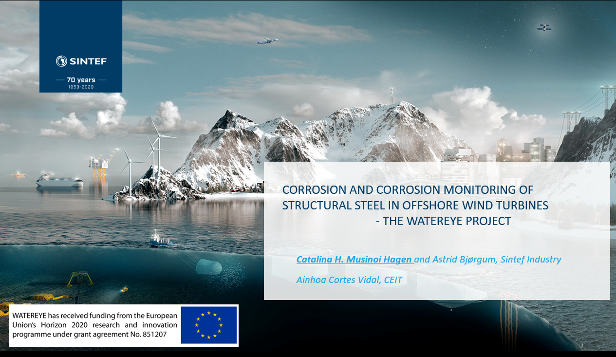 • C. H. M. Hagen, A. Bjørgum,A. Cortés Vidal. Corrosion and corrosion monitoring of structural steel in offshore wind turbines. EERA DeepWind 2021 conference (https://www.sintef.no/projectweb/eera-deepwind/ 13 – 15 January 2021 (oral presentation)
